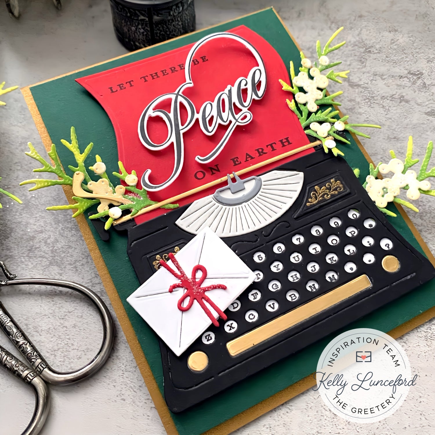 This week's Card of the Week is by Inspiration Team member Kelly Lunceford, featuring our Vintage Type typewriter all decked out for the holidays. Kelly used a sentiment from our Scripted Holiday Sentiments set and tucked in some BotaniCuts Juniper sprigs, then finished it off with a cute little envelope cut using our Sent with Love die.